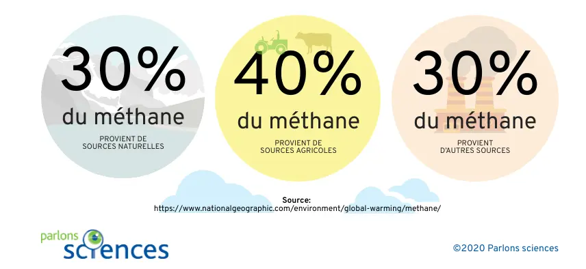 30 % du méthane provient de sources naturelles, 40 % de sources agricoles et 30 % d’autres sources d’origine humaine.